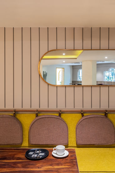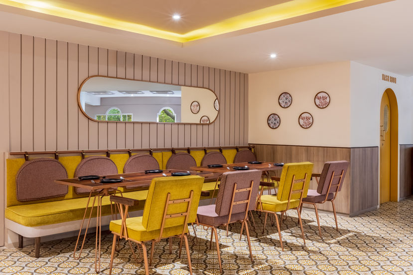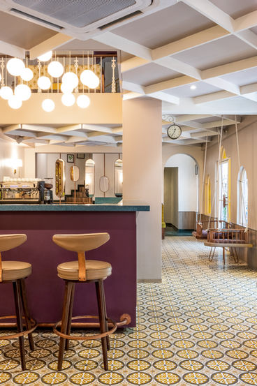 We strayed away from the typical old villa colour palette to add an element of new. The inspiration behind the palette was Wes Anderson. We used striking colours to make for a bold space. Pastel hues engulf the space giving it a distinct whimsical feel. These colours stand out against each other yet blend in seamlessly giving the space a refreshing look rather than making it look dreary. We have made a conscious effort to acknowledge the colours. The idea was to transport the users of the space into another continuum using colour psychology.