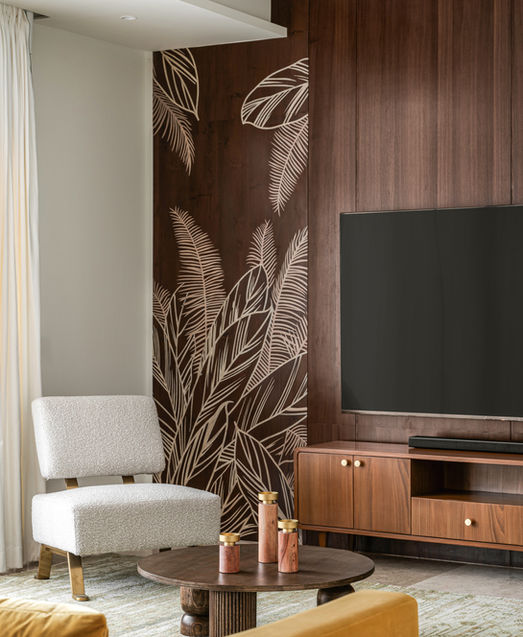 As you explore the home further, the study room seamlessly blends old-school charm with a touch of modernism and tranquil ambience facing the pool. The shelves and cabinets are adorned in a deep, timeless Oxford blue, setting a classic backdrop that exudes a sense of depth and sophistication. A whimsical kids' bedroom where the serene charm of pastel green meets boho-inspired details, creating a cosy and personalised space. This room is designed to delight with its unique elements and thoughtful customisation tailored to meet storage needs, the drawers are cleverly integrated into the room's layout, with pull-out vertical drawers that are flush with the unit. For the master bedroom, we worked with dark woods and powdered blue colour scheme with a customised chinoiserie wallpaper. Arches were a prominent feature that added character to the space. We kept the language going through the furniture structures. A cosy guest bedroom with rattan elements and a mauve sloped ceiling was a delight. The media room was transformed with a unified, curved ceiling finished in bold green.